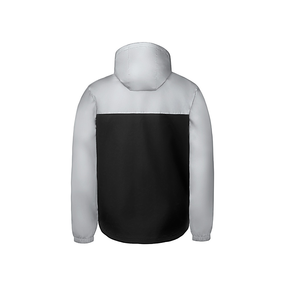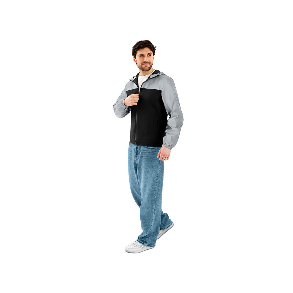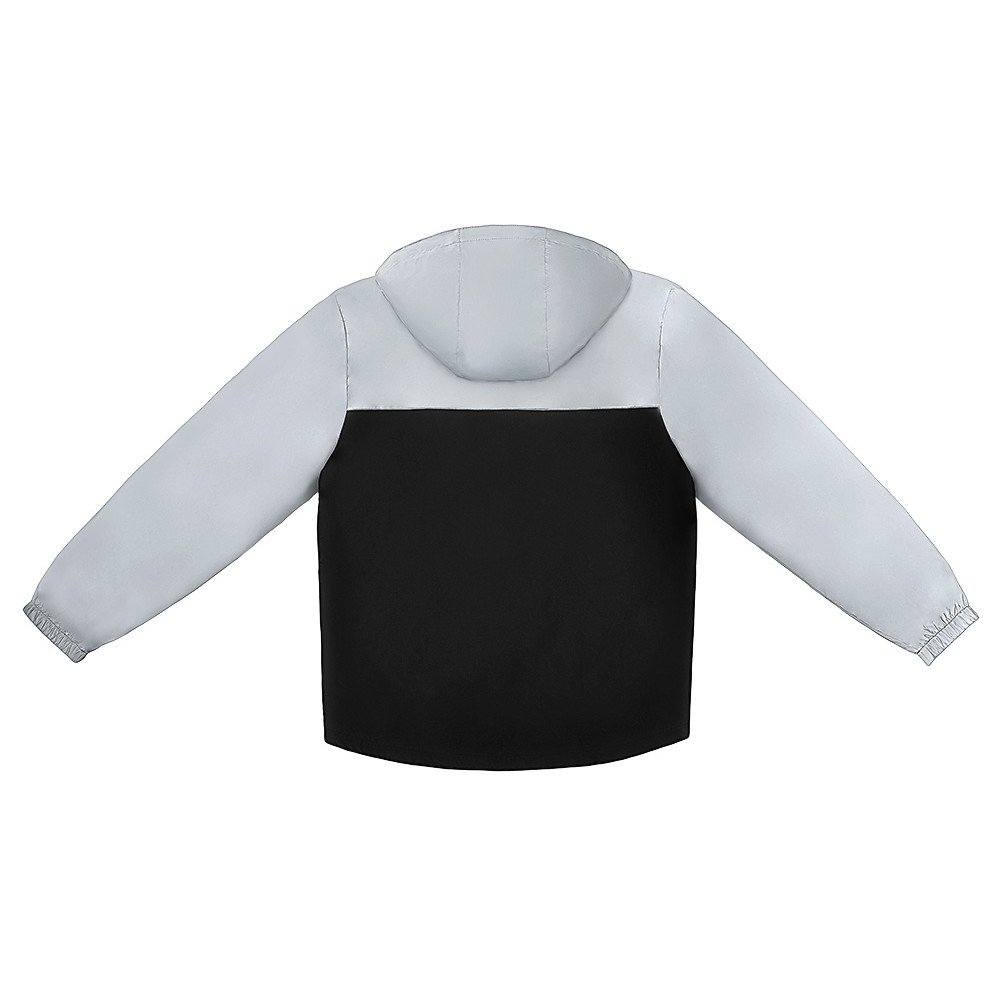 Streetwear-ветровка с контрастным дизайном: верх переда и спинки, рукава и капюшон — из светоотражающей ткани, низ — из прочной чёрной полиэстеровой ткани. Модель на подкладке, со спинкой длиннее переда. Детали: водонепроницаемая молния, боковые наклонные карманы с листочкой, манжеты на резинке, удобный капюшон, кулиска по низу. • Заметность в темноте — светоотражающая верхняя часть повышает безопасность. • Защита от ветра и дождя — влагостойкая молния и плотная ткань. • Комфортная посадка — удлинённая спинка и подкладка для межсезонья. • Универсальный городской стиль — легко сочетается с повседневным гардеробом.