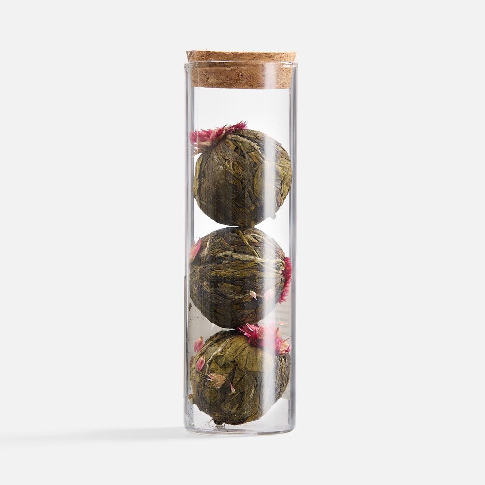 - связанный зеленый чай с цветами «Нефритовый Лотос» (состав: зеленый чай сенча, цветы хризантемы), вес 25 г — благодаря особой технологии скрутки чай, словно цветок, распускается в чайнике или чашке, при заваривании рекомендуем использовать прозрачную стеклянную посуду;