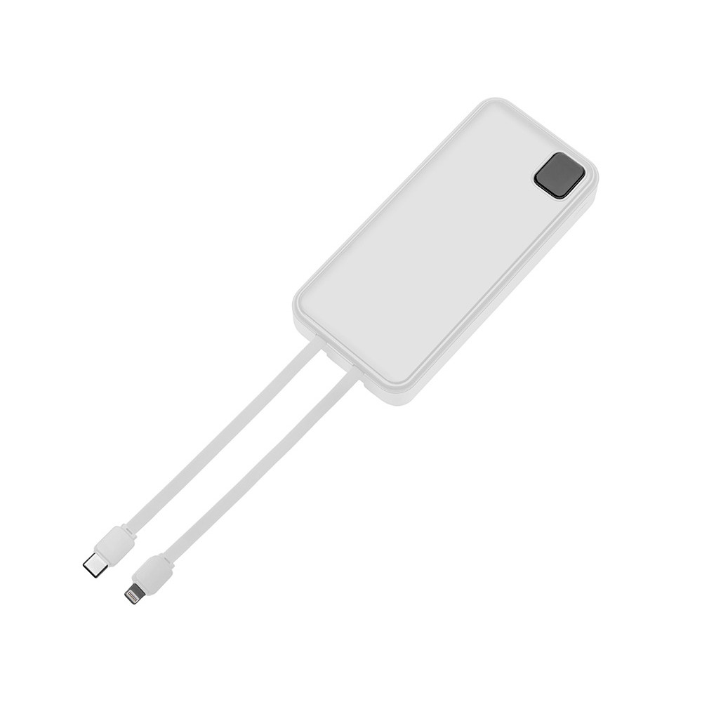 Удобный внешний аккумулятор с функцией быстрой зарядки и встроенными кабелями USB-C (симметричный разъём USB тип С) и Lightning (разъём в ранних версиях iPhone) — ваш надежный партнер в путешествиях, на встречах и в повседневных задачах. Цифровой дисплей в реальном времени показывает точный остаток заряда и статус быстрой зарядки, а встроенные кабели и несколько разъемов позволяют заряжать до 4 устройств. Прочный корпус из переработанного АБС-пластика и емкость 20000 мАч обеспечивают зарядом все ваши устройства на долгий срок. Идеальный выбор для тех, кто ценит комфорт и функциональность в одном устройстве. Продуманная упаковка: для открытия просто потяните за язычок, и появится гаджет с нанесением.
